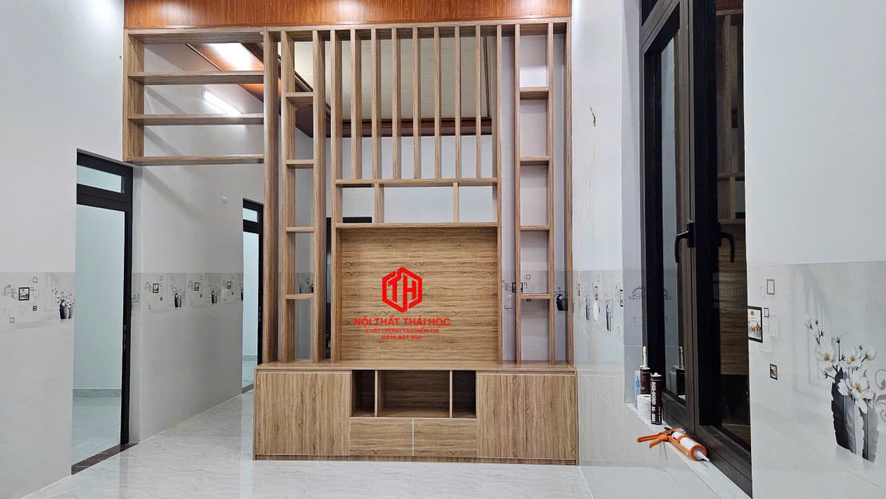 • Nội thất phòng khách: Trần nano, kệ ti vi, vách ngăn